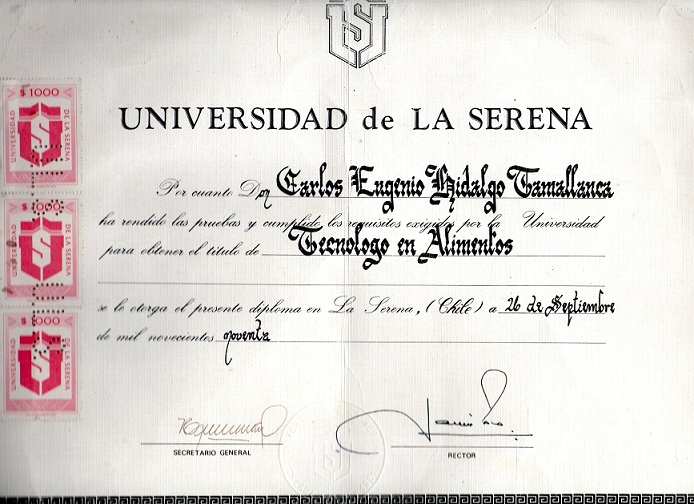 Me cambié a esta carrera, desde nutrición y dietética en Chillán. Ingresé cómo Universidad de Chile, pero egresé por La Universidad de La Serena, pues en el año 1982 se fusionó la U. de Chile con la Universidad Técnica del Estado creando la casa de estudios por la que me titulé.